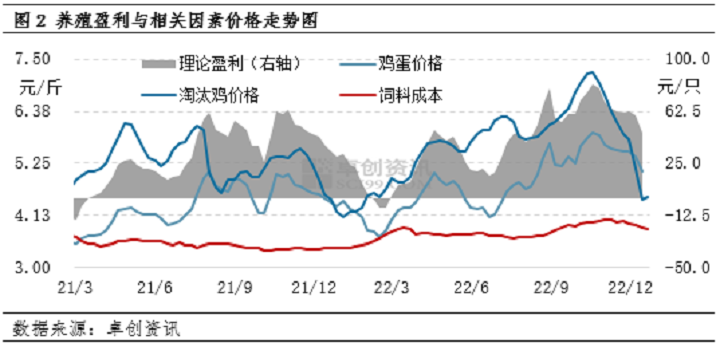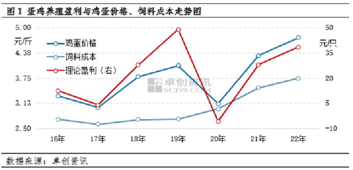2022年雞蛋、淘汰雞價格雙雙走高,但受飼料成本上漲拖累,盈利水平不及業者預期。2023年飼料成本將小幅下降,養殖盈利或提升。