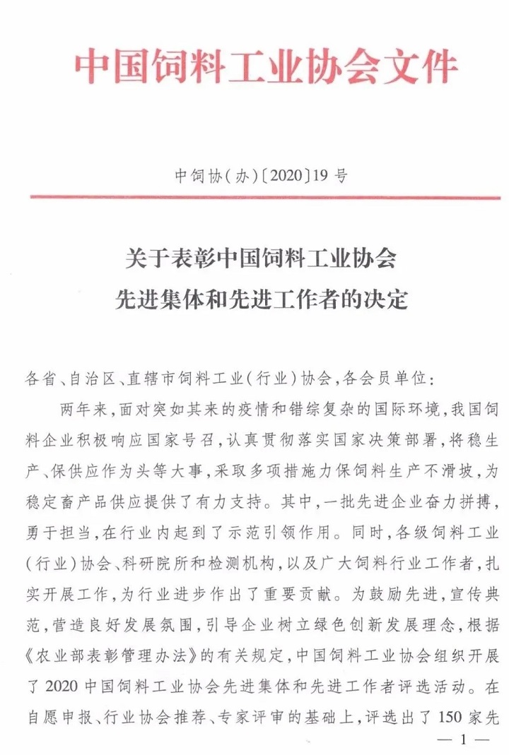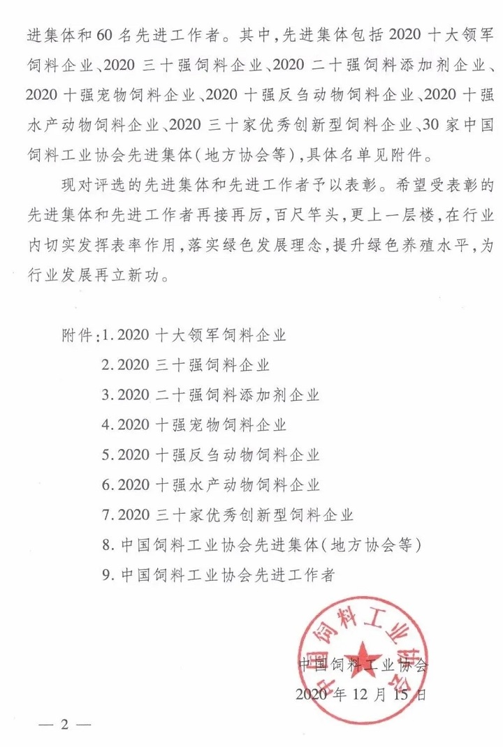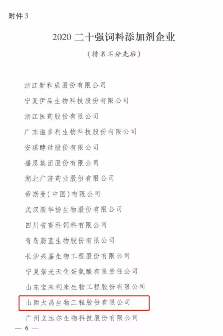 【喜訊】大禹生物榮獲2020全國二十強(qiáng)飼料添加劑企業(yè)稱號(hào)
