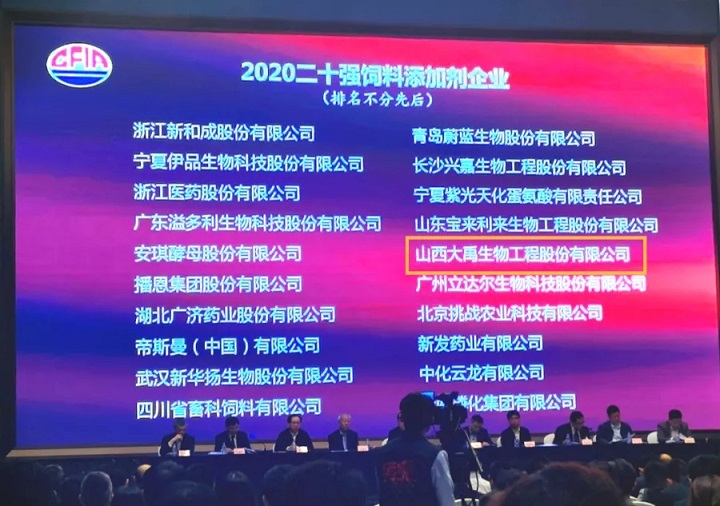 山西大禹生物工程股份有限公司獲評“2020二十強飼料添加劑企業”榮譽稱號,并受到農業農村部領導高度評價。