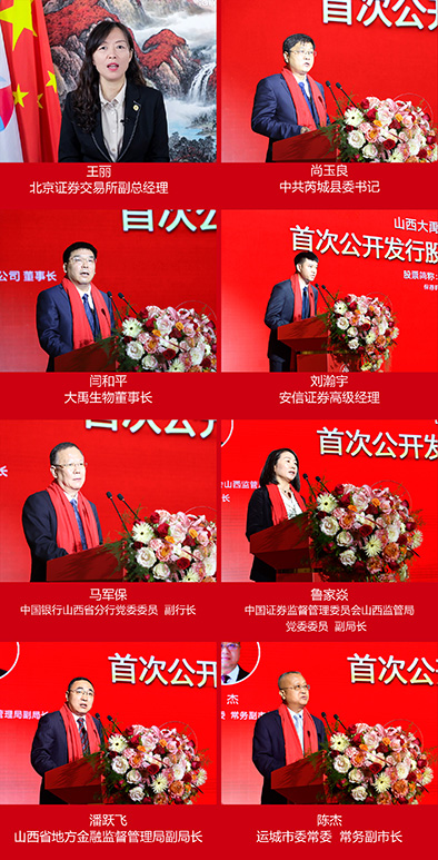 同時,還有大禹生物股東代表、董事、監事、高管代表、特邀代表,中介機構、客戶代表、員工代表,以及在大禹生物發展過程中予以我們支持、幫助、合作的各界伙伴,人民日報、新華社、中央電視臺、上海證券報、證券時報、山西日報、山西電視臺、山西新聞網等媒體的記者朋友。北京證券交易所副總經理王麗女士通過視頻連線發來祝賀。