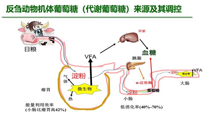 反芻動物70%-80%的能量來源于揮發性脂肪酸(VFA),飼料中的碳水化合物如淀粉、果膠、果聚糖、可溶性糖、纖維素、半纖維素和木質素,在瘤胃中被微生物降解產生能量、氣體(甲烷、二氧化碳)、熱量和酸。乙酸、丙酸和丁酸均屬于揮發性脂肪酸,它們構成了瘤胃中產生的絕大部分酸(95%)。大部分丙酸在肝臟中被轉化成葡萄糖。另一方面,過瘤胃淀粉經過淀粉酶的分解產生葡萄糖,通過小腸吸收進入血液。