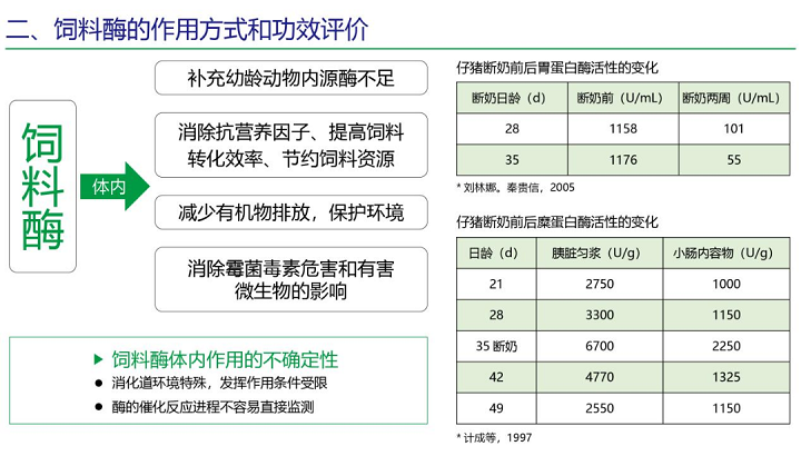 飼料酶在體內(nèi)可以補(bǔ)充幼齡動(dòng)物內(nèi)源酶不足、消除抗?fàn)I養(yǎng)因子、提高飼料轉(zhuǎn)化效率、節(jié)約飼料資源、減少有機(jī)物排放,保護(hù)環(huán)境、消除體內(nèi)霉菌毒素危害和有害微生物的影響。